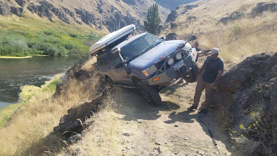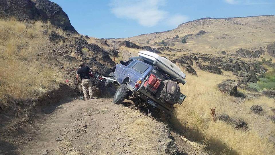 This story comes to us from Dan Griffin, owner of 2Xplore out of Vancouver, WA. A normal day on the trail turned into a nightmare when a vehicle from the group began to slide off of the trail towards a 200 foot drop into a river. Thanks to some ingenuity and a couple Hi-Lift Jacks, they were able to stabilize the truck and pull it back onto the trail.