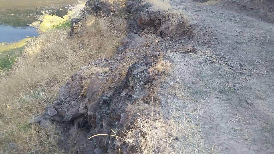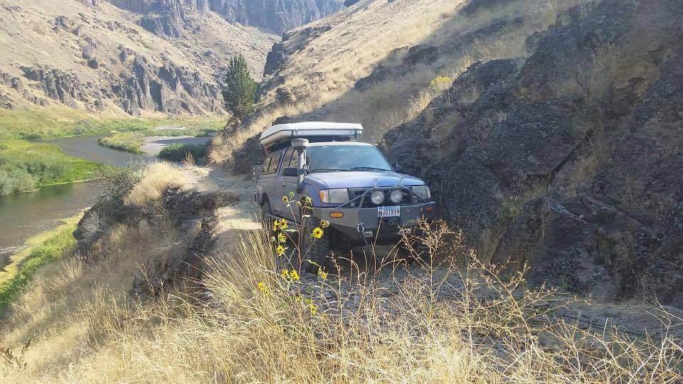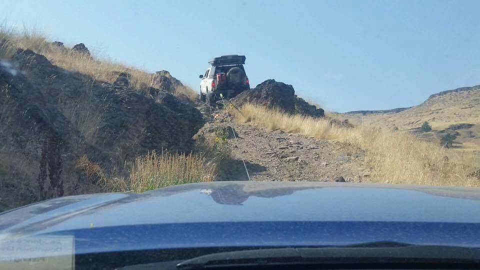As Will began to spot me, Mike moved up the trail a bit behind me. As he did, a 3-4-foot section of the trail gave out causing Mike’s right rear tire to slide off the road. All I could see in my rear-view mirror was a cloud of dust and Mike’s truck teetering as if it was about to roll off the trail down 200 feet to the Owyhee river. Will quickly ran down the trail to further assess the situation and signaled for me to back down.